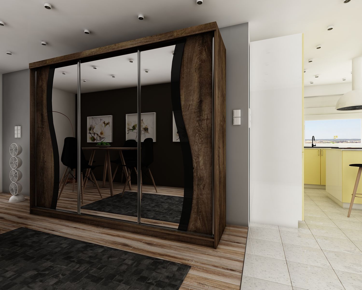 Szafa przesuwna SENSO 9 250 cm ze wstawkami dekoracyjnymi szklanymi i trzema lustrami, dwie fale