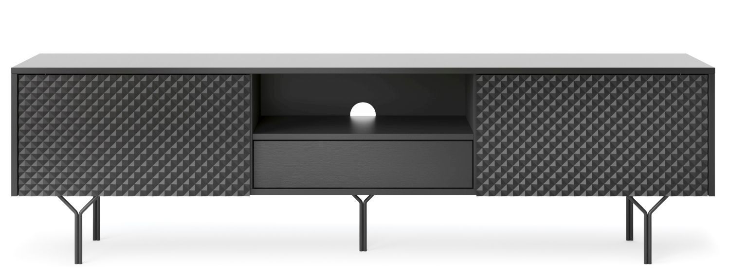 Szukasz eleganckiej szafki RTV, która połączy nowoczesność z wyrafinowanym stylem? Model ROYAL o szerokości 180 cm to mebel, który zachwyca czarnym wykończeniem oraz frezowanym frontem o geometrycznym wzorze. To wyjątkowe połączenie subtelnego minimalizmu i designerskiego charakteru, idealne do wnętrz w stylu nowoczesnym lub glamour.Szafka została wyposażona w dwie pojemne szafki, praktyczną szufladę oraz otwartą półkę na sprzęt RTV. Metalowe nogi w ciemnym kolorze nadają konstrukcji lekkości i stabilności, a precyzyjnie wykonane detale podkreślają wysoką jakość mebla. Matowa czerń nadaje całości elegancji i stanowi doskonałe tło dla nowoczesnych aranżacji.