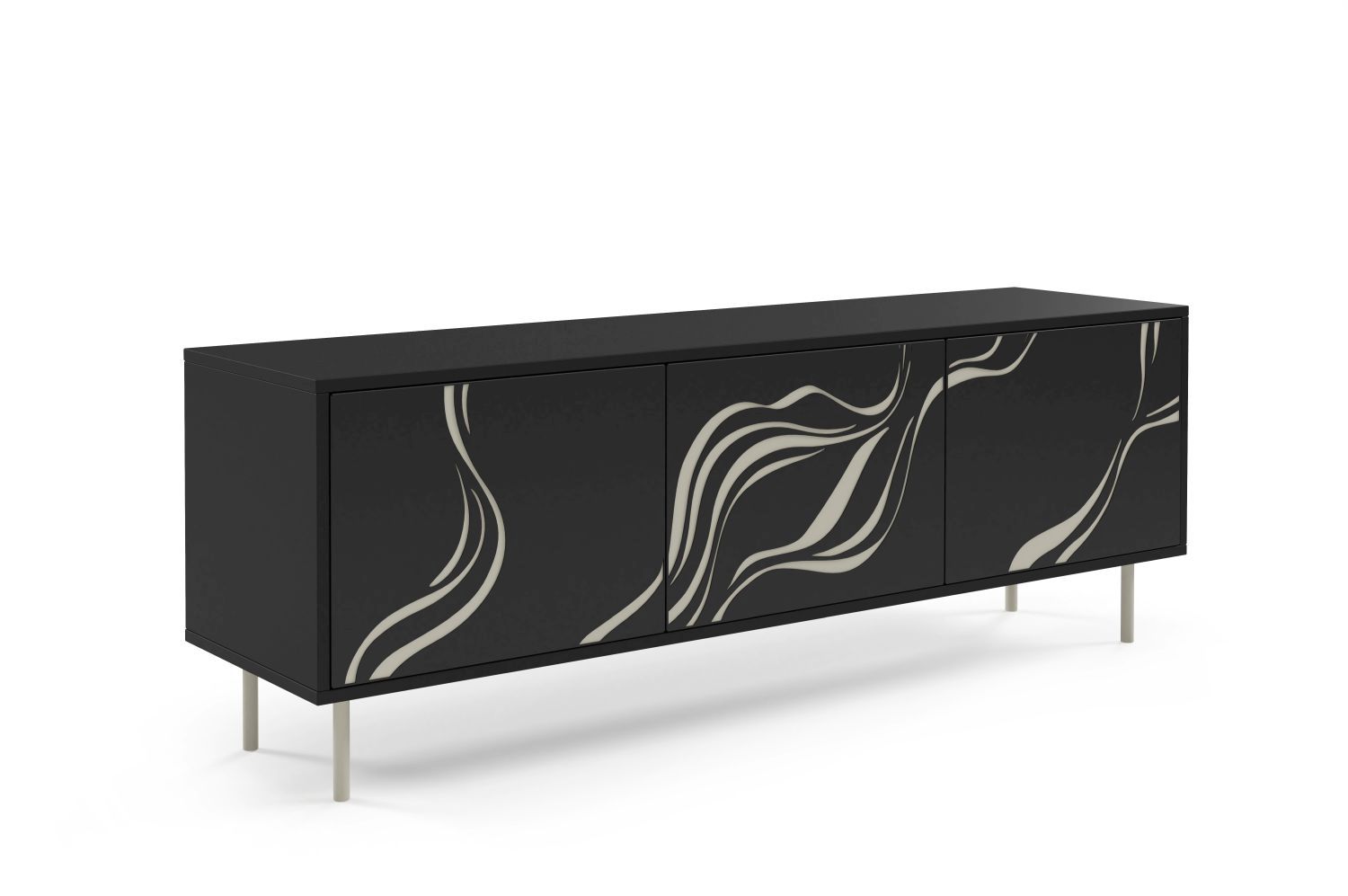Szafka RTV trzydrzwiowa MARMORO 161 cm front z dekoracyjnym falistym wzorem, czarny