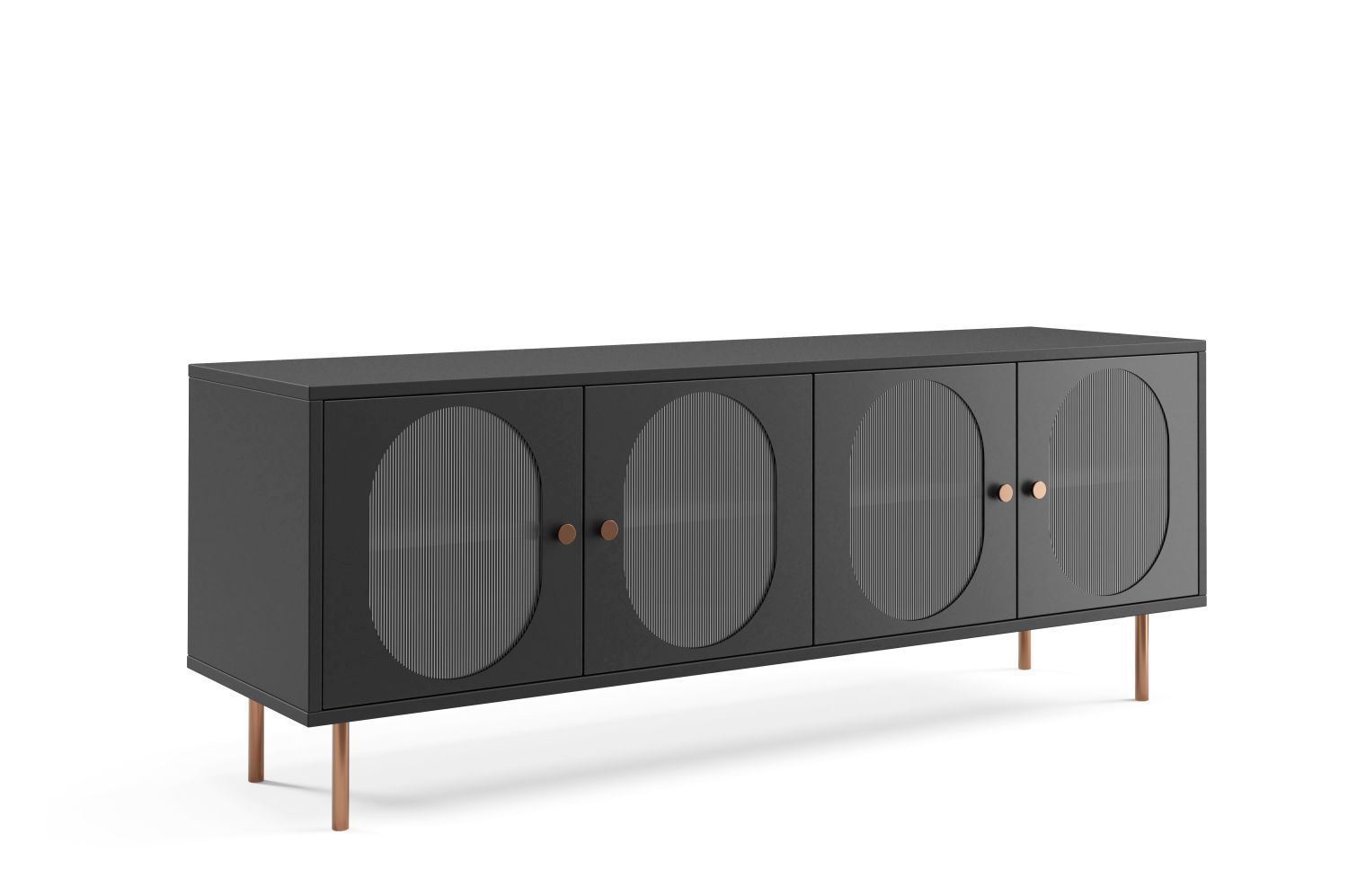 Styl retro w nowoczesnym wydaniu. Szafka RTV VOLT o szerokości 161 cm w kolorze czarnym wyróżnia się czterema przeszklonymi frontami o zaokrąglonym kształcie, które nadają jej wyjątkowego charakteru. Przydymione szkło subtelnie eksponuje wnętrze, a drewniane detale wprowadzają ciepło i elegancję.Osadzona na smukłych, drewnianych nogach, prezentuje się lekko i nowocześnie. Idealna do wnętrz w stylu retro, skandynawskim lub mid-century, gdzie liczy się design i funkcjonalność.
