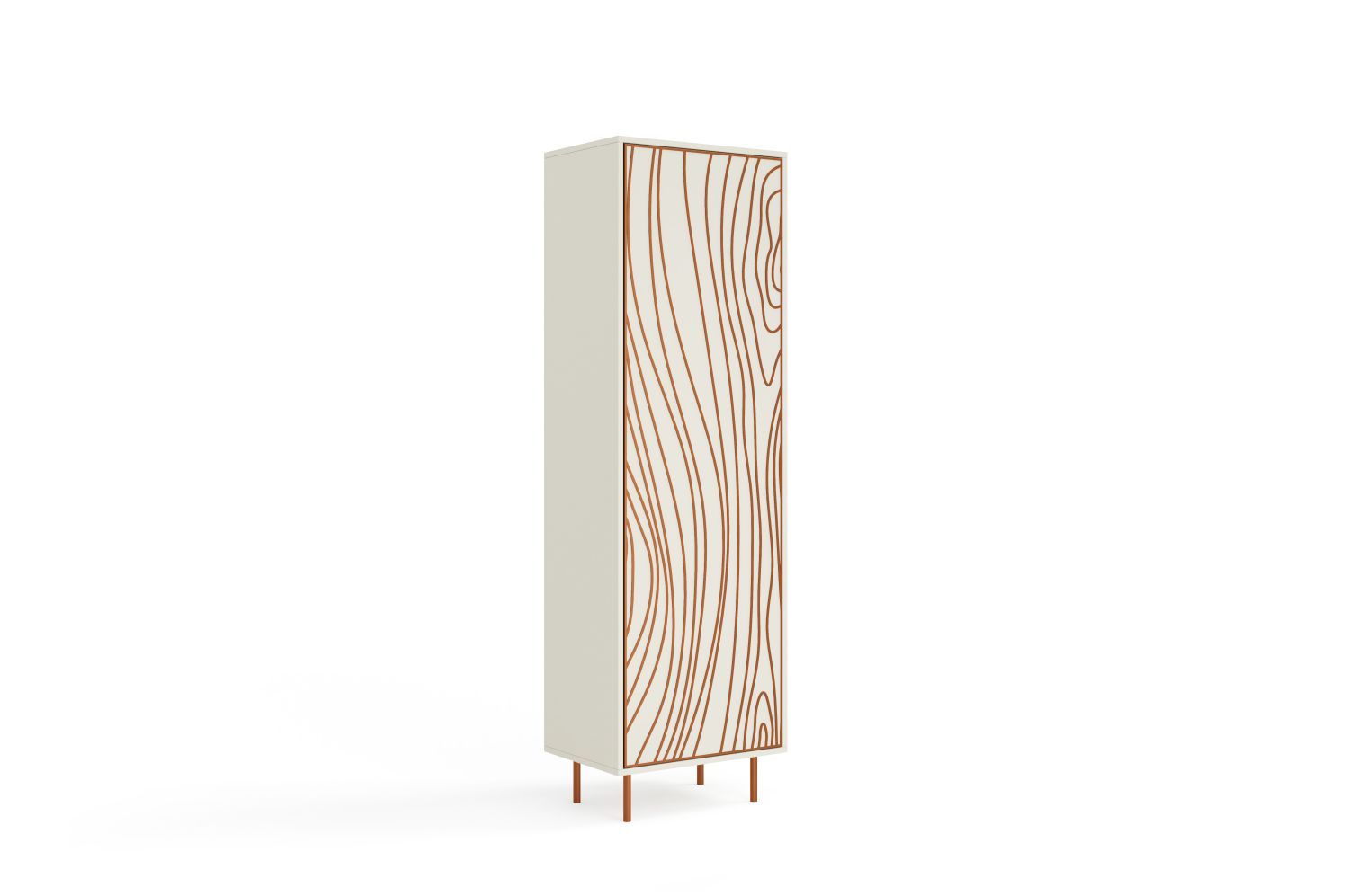 Nowoczesny design z artystycznym charakterem. Witryna ALTORE o wysokości 200 cm w kolorze kaszmir przyciąga wzrok unikalnym frontem zdobionym brązowym wzorem, który tworzy efekt falujących linii inspirowanych naturą. Smukła konstrukcja na metalowych nogach nadaje meblowi lekkości i elegancji.Dzięki połączeniu stonionej kolorystyki z artystycznym detalem, witryna świetnie komponuje się zarówno z wnętrzami nowoczesnymi, jak i bardziej klasycznymi, wprowadzając do nich subtelny akcent luksusu.