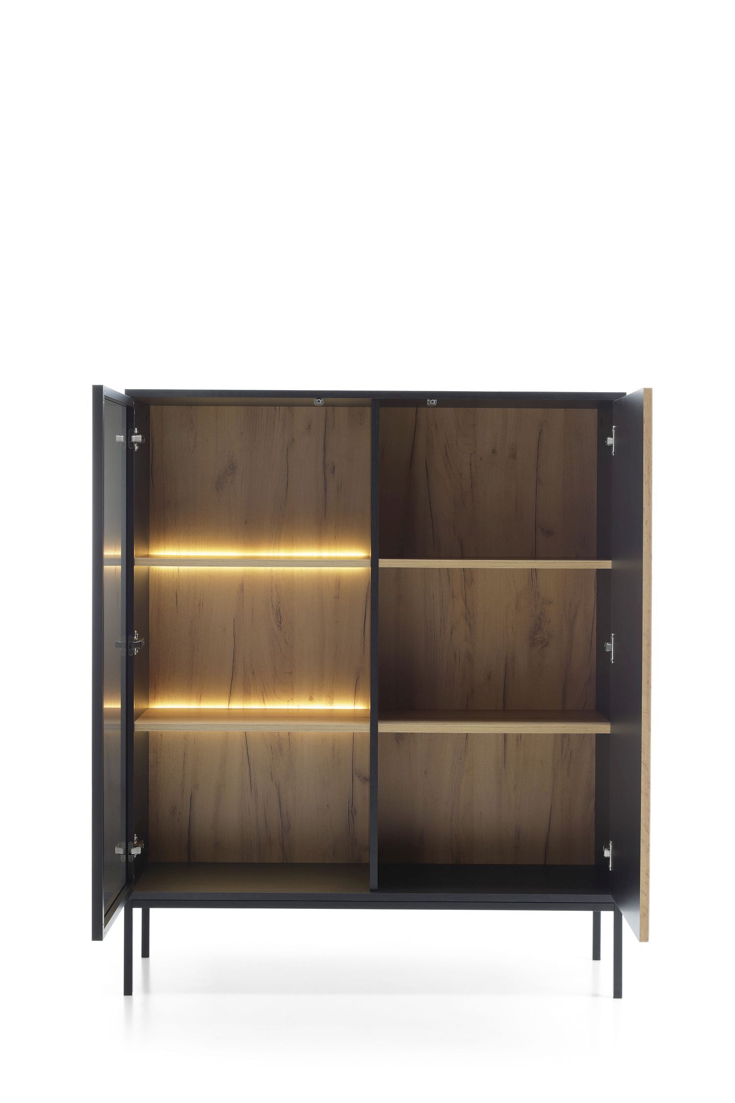 Witryna dwudrzwiowa SORO wysoka 103 cm przeszklona z LED, lamele, czarny, dąb wotan