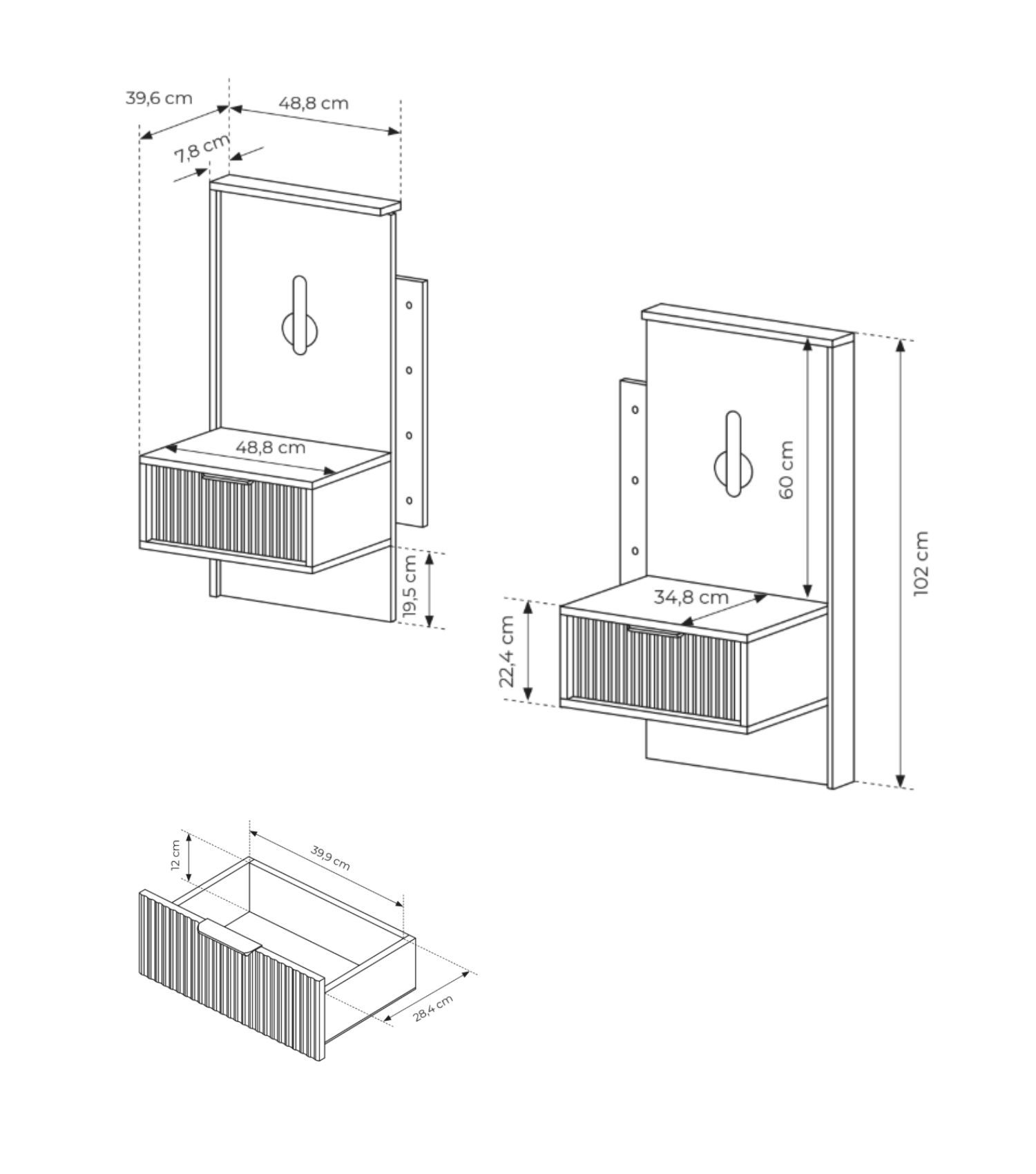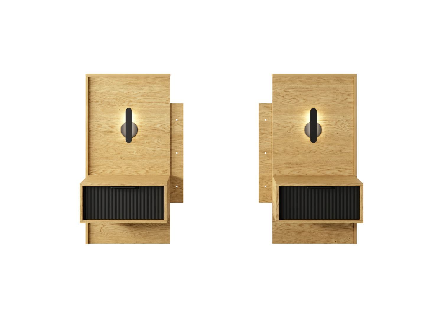 Szukasz nowoczesnych stolików nocnych, które połączą elegancję z funkcjonalnością? Zestaw dwóch stolików nocnych LILLY o szerokości 48 cm w kolorze dąb baltic z ryflowanym czarnym frontem to stylowa propozycja dla osób ceniących oryginalne i dopracowane detale. Połączenie naturalnego drewna z kontrastującą czernią tworzy efektowny, nowoczesny duet.Każdy stolik nocny LILLY wyposażony jest w pojemną szufladę na drobiazgi oraz zintegrowane oświetlenie LED, które tworzy nastrojowy klimat i podkreśla ryflowaną strukturę frontu. Meble montowane do ściany prezentują się lekko i elegancko, jednocześnie zapewniając maksymalną funkcjonalność w codziennym użytkowaniu.